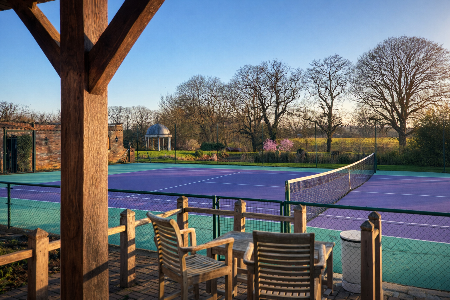 Perfectly positioned to accompany the court, the pavilion offers an inviting space to relax before or after a game, whether entertaining guests, enjoying a quiet morning coffee, or simply taking in the peaceful setting.